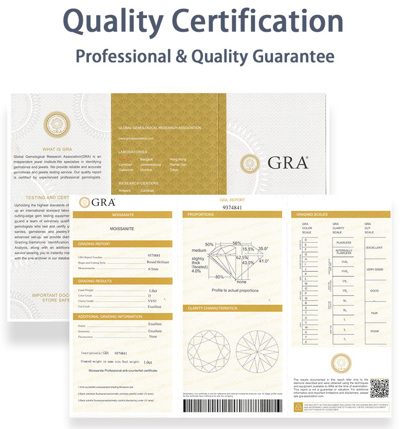 A pair of earrings, a gift box, a warranty card, a GRA moissanite report